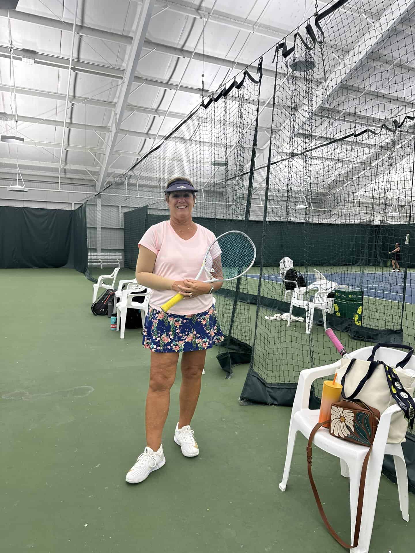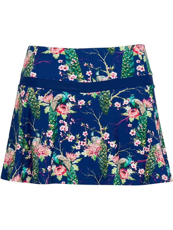 This mid-rise breeze skirt with attached navy undershort features a soft four-way stretch printed fabric in navy, with shades of pink, green, turquoise berry, and vanilla accents. It is designed for pickleball or tennis.