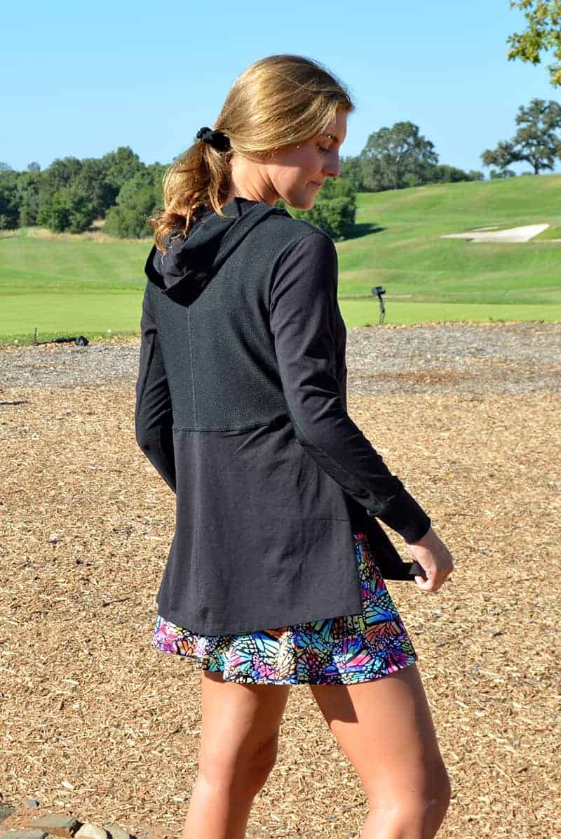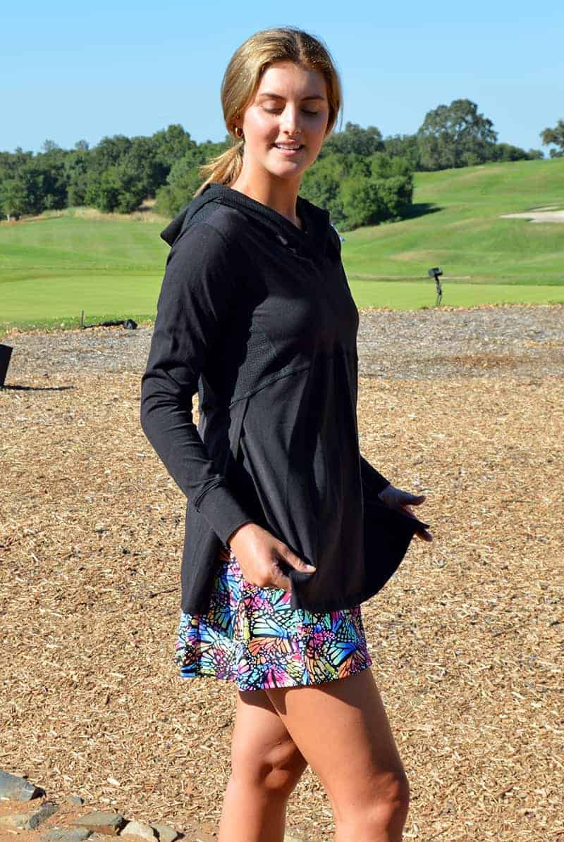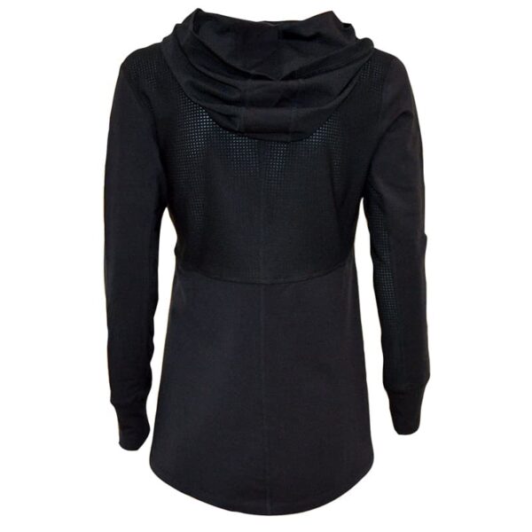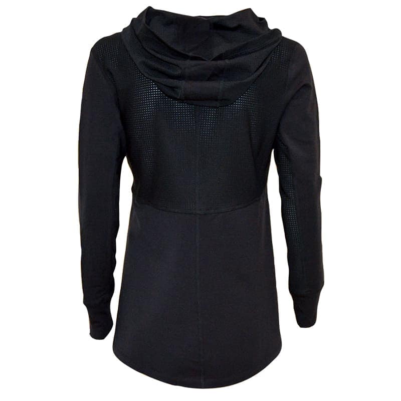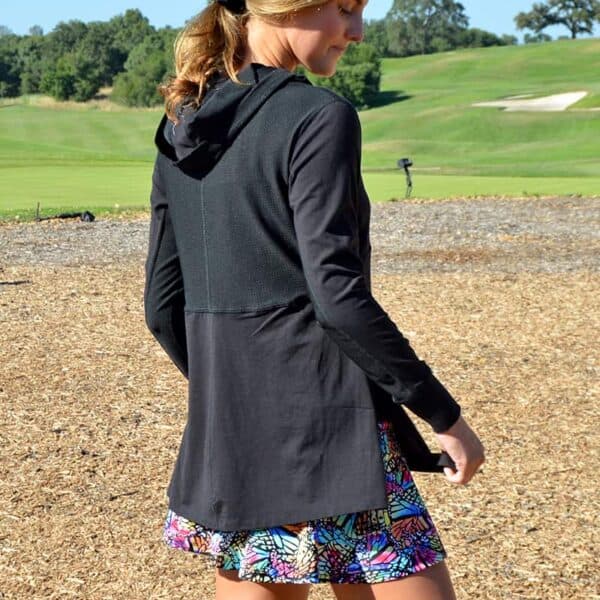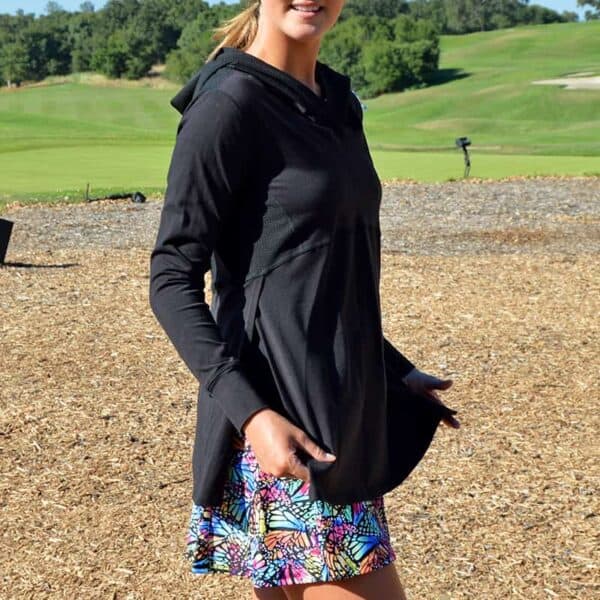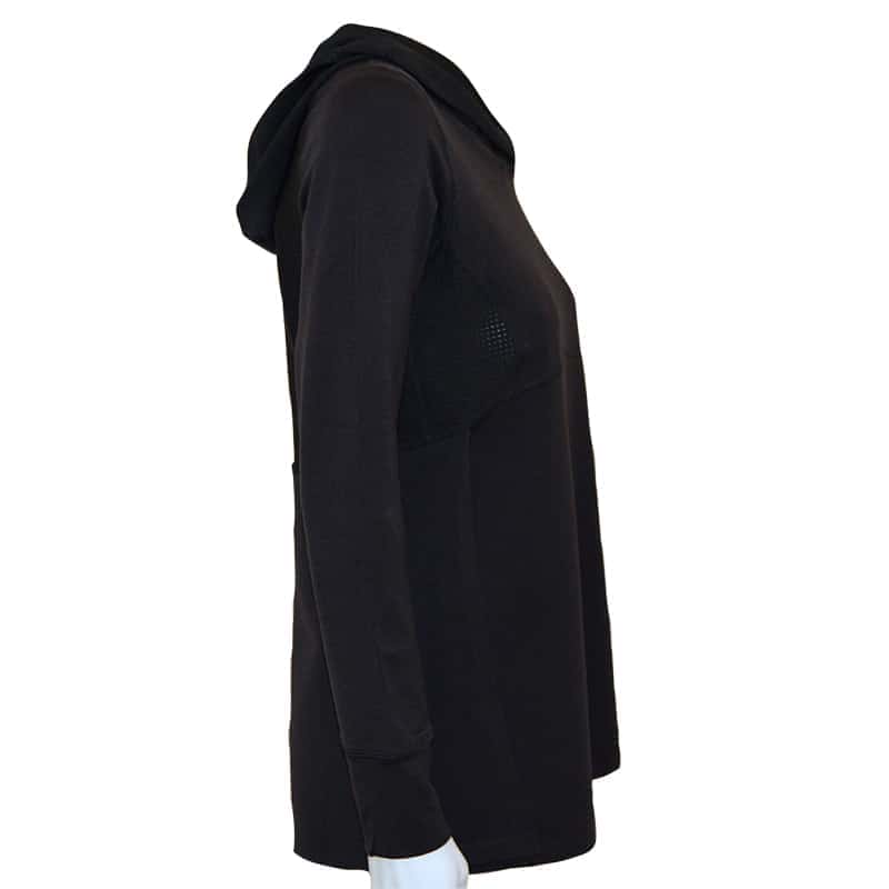 Black mesh hooded pullover with mesh underarm inserts to keep you cool. Skim the upper body fit with a flap front opening—the perfect pullover for tennis, pickleball, golf, the gym, or just running an errand.