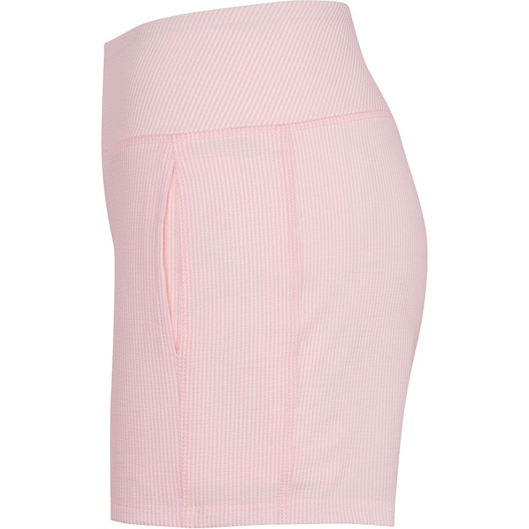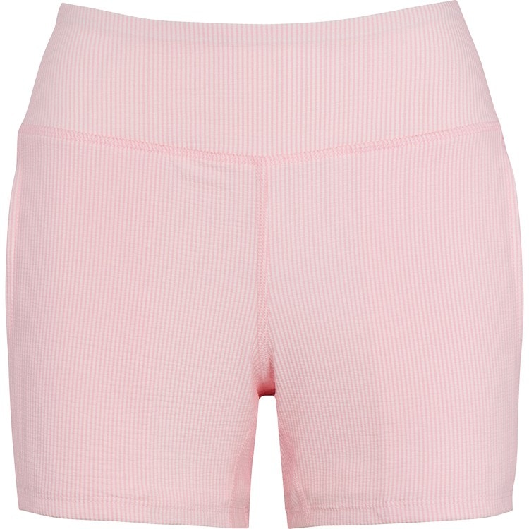 These Layer Me pink seersucker shorts come with an attached solid light pink undershort and two large side pockets. They are styled to be worn on or off the court.