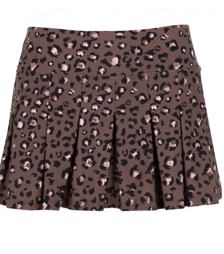 For ladies who prefer a slightly longer tennis skirt, BPassionit offers a pleated tennis skirt option in a classic leopard print with a touch of soft pink. Skirt features flat, wide pleats with an attached black, moisture-wicking undershort.