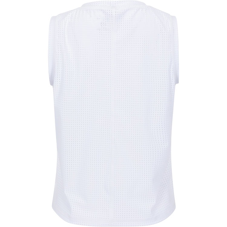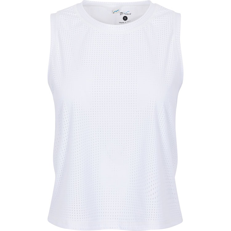 This white air tank top is perfect for those ladies who are short-waisted or prefer a more cropped length. The tennis top is sewn in a breathable white dot mesh.